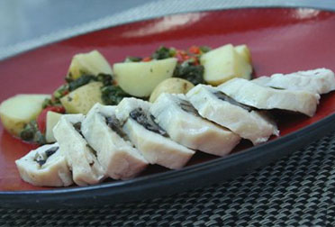 3. En el centro de las pechugas, coloca una buena porción de rajas, y otra de elotes y a continuación enrolla la pechuga. Ayúdate de unos palillos para cerrarlos.